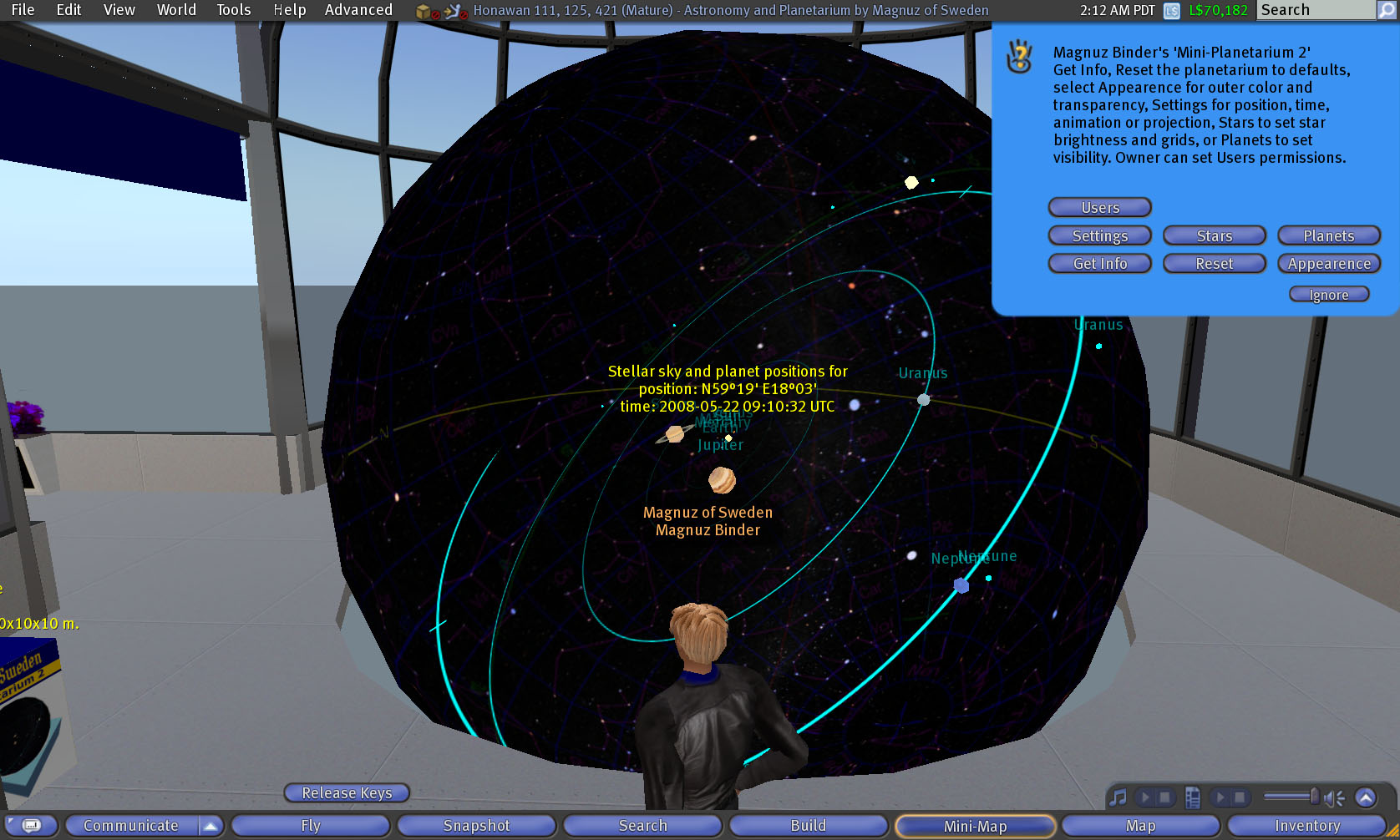 AstroDemo1_002 size: 1676x1006 px, 239 kB description: view, object and avatar, mini-planetarium 2 and Magnuz Binder